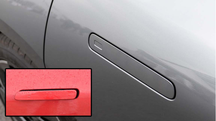 这台试驾车还选装了“智能感应自动门套装”,其实就是四门电吸门+感应记忆后备厢门。选装之后门把手是隐藏式设计的,如果没选装会是小图那种设计。