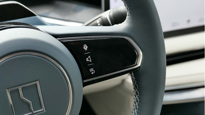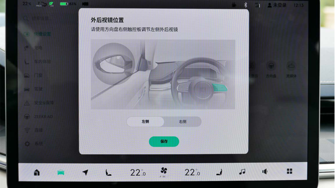 例如要调节外后视镜的角度,你必须现在屏幕先选择它,然后通过方向盘右边这块黑色区域,按上下左右来调整...