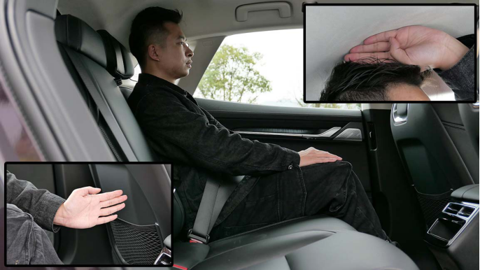 后排头部空间不算好,约为三指左右,不过腿部表现很满意,跷二郎腿都不是事。