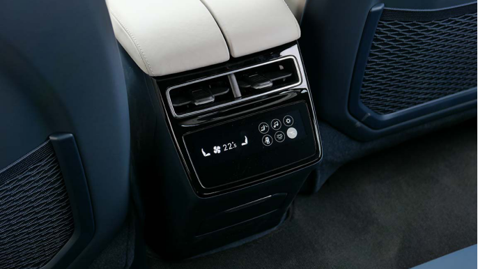 而这台车也选装了“智能恒温空调套餐”,除了三区自动空调和智能香氛,后排这里还会多了一个5.7英寸的触控屏,可以调节空调和一些功能。