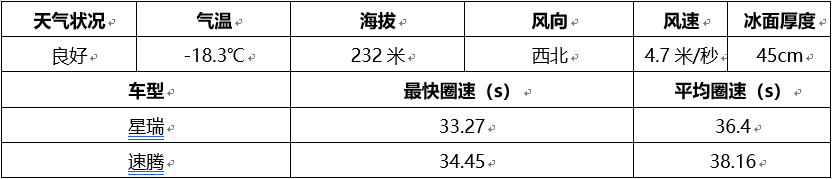 继AEB制动测试之后,第二项圆环竞速选在厚1125px、直径200m的冰面上进行,两车分组通过数十轮挑战,星瑞最佳圈速时间为33.27s,速腾为34.45s,并且在平均圈速上,星瑞更是以将近2s的优势远超速腾。