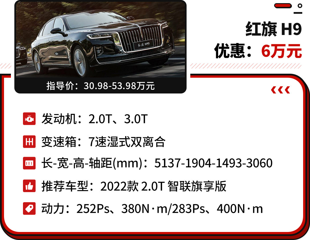 如果没有6缸和机械增压情怀的话,其实红旗H9 2.0T版本的综合表现会更好,其中推荐买中配车型,因为入门配置体验一般,中配与高配的配置相比差距不大。