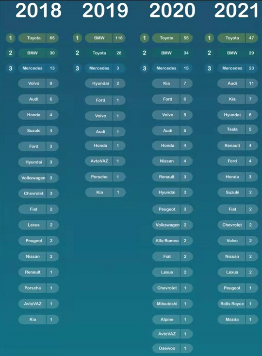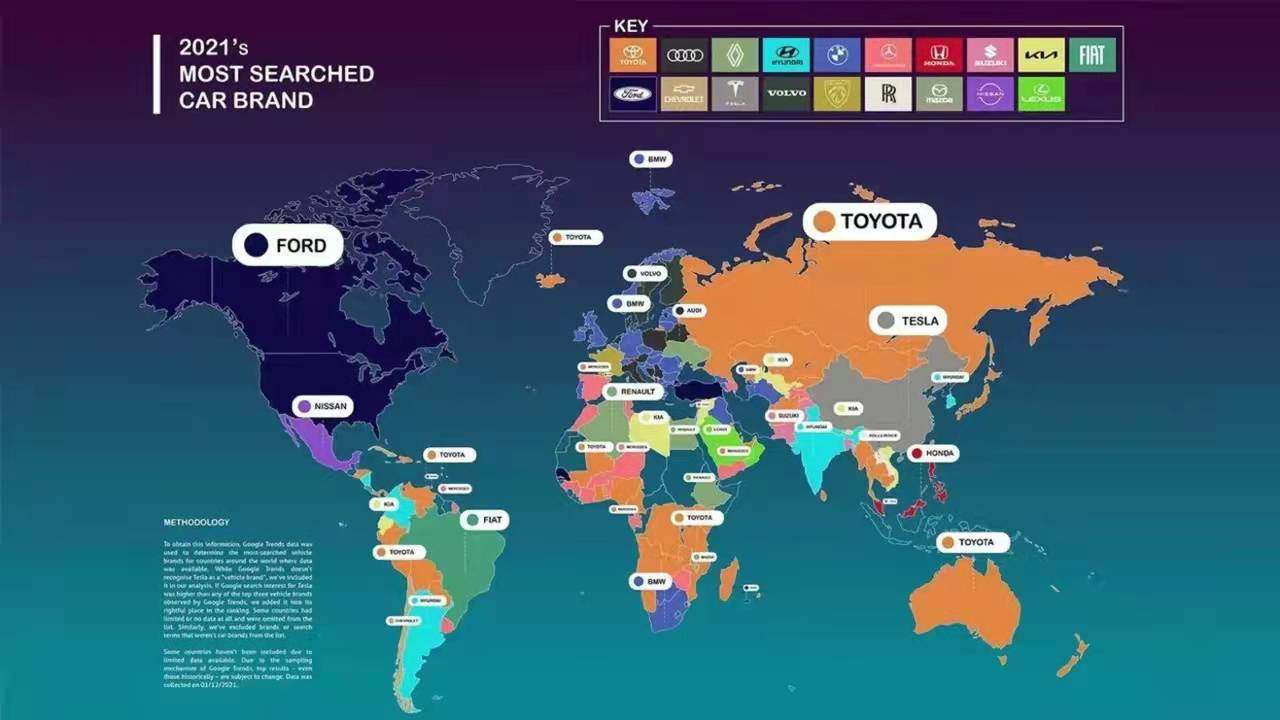 从公布数据可见,2021年丰田在总体搜索量中排名最高,而且在统计的154个国家/地区中,丰田占据搜索量榜首就高达47个,其中这些国家/地区也主要包括澳大利亚、俄罗斯和日本。
