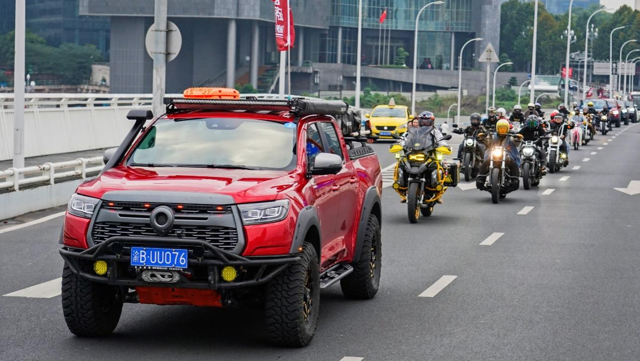重庆,长城炮与机车开启城市巡游,展示皮卡文化与机车文化的激情碰撞。