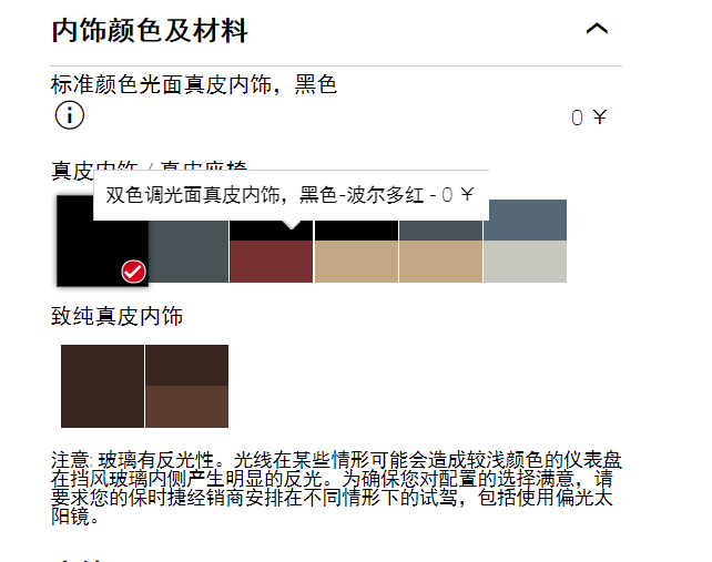 另外,同样为了满足用户个性化需求,新车可提供8种内饰配色可选,其中包括了黑色、板岩灰、黑色-波尔多红、黑色-莫哈韦米色、板岩灰-莫哈韦米色和石墨蓝-哑灰真皮内饰(以上均为免费),以及致纯真内饰松露棕(选装费用9,100)、松露棕-雪茄棕(选装费用15,000)。而如果普通版车型选择这些内饰颜色,需要花费4,400-63,100元之间不等。