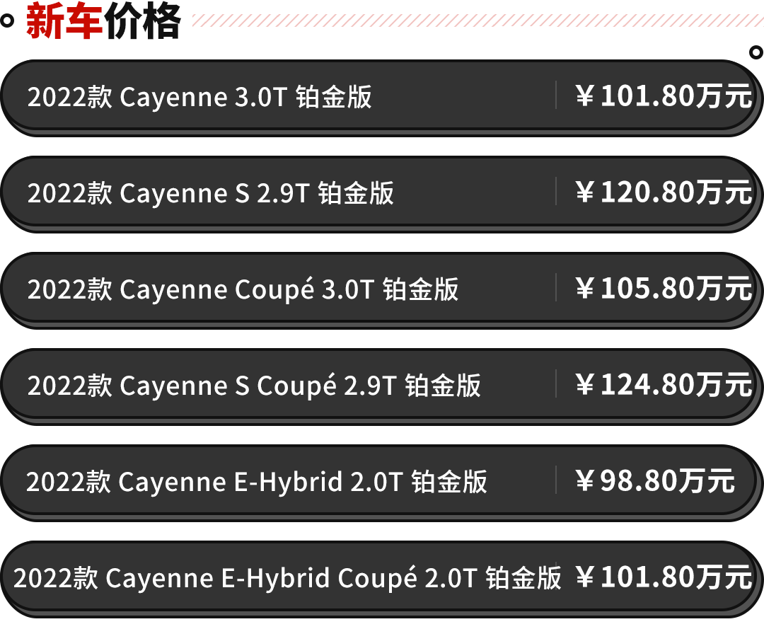 保时捷的铂金版曾会出现在非限量车型上,包括每一代的911、718、Panamera、Cayenne等等。而新款保时捷Panamera铂金版在上个月上市后,这一代的Cayenne铂金版也在近日正式上市了,其涵盖了Cayenne和Cayenne Coupé的基础版、S版、E-Hybrid,共计6款车型,具体售价如下: