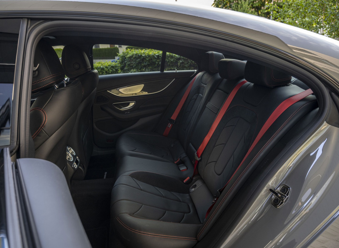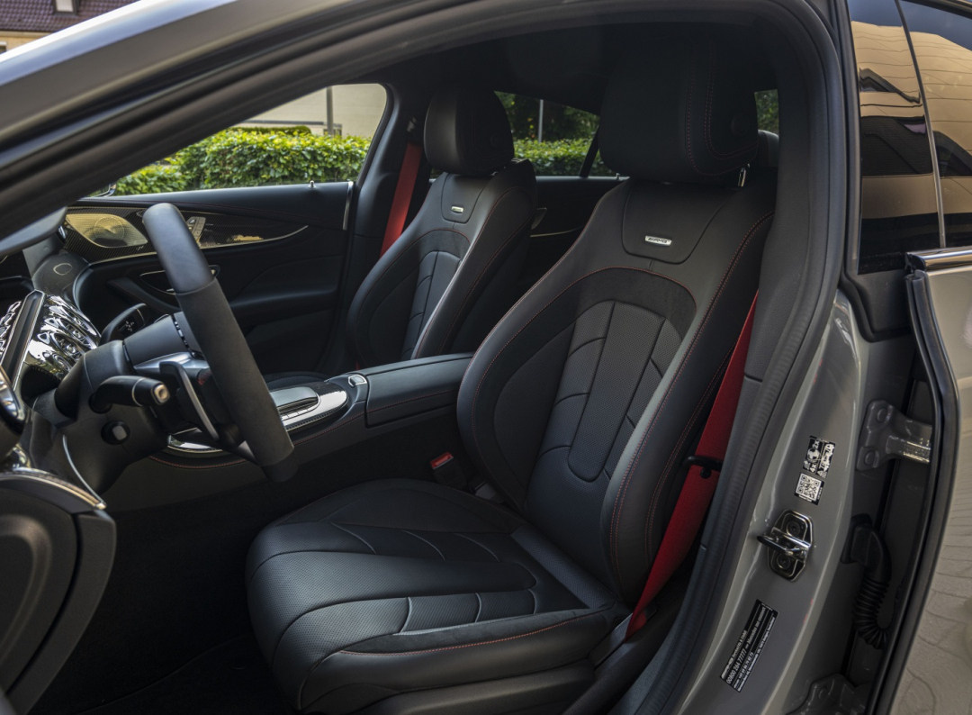 另外,CLS 53 AMG还配备了奔驰最新的运动式方向盘,材质上结合了纳帕皮革与翻毛皮,但看着图片就很有驾驶欲望。座椅也采用了运动一体式设计,配合红色安全带,非常有格调。