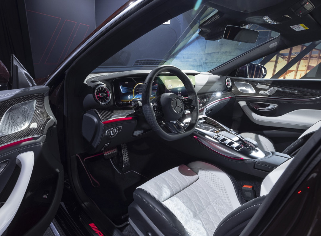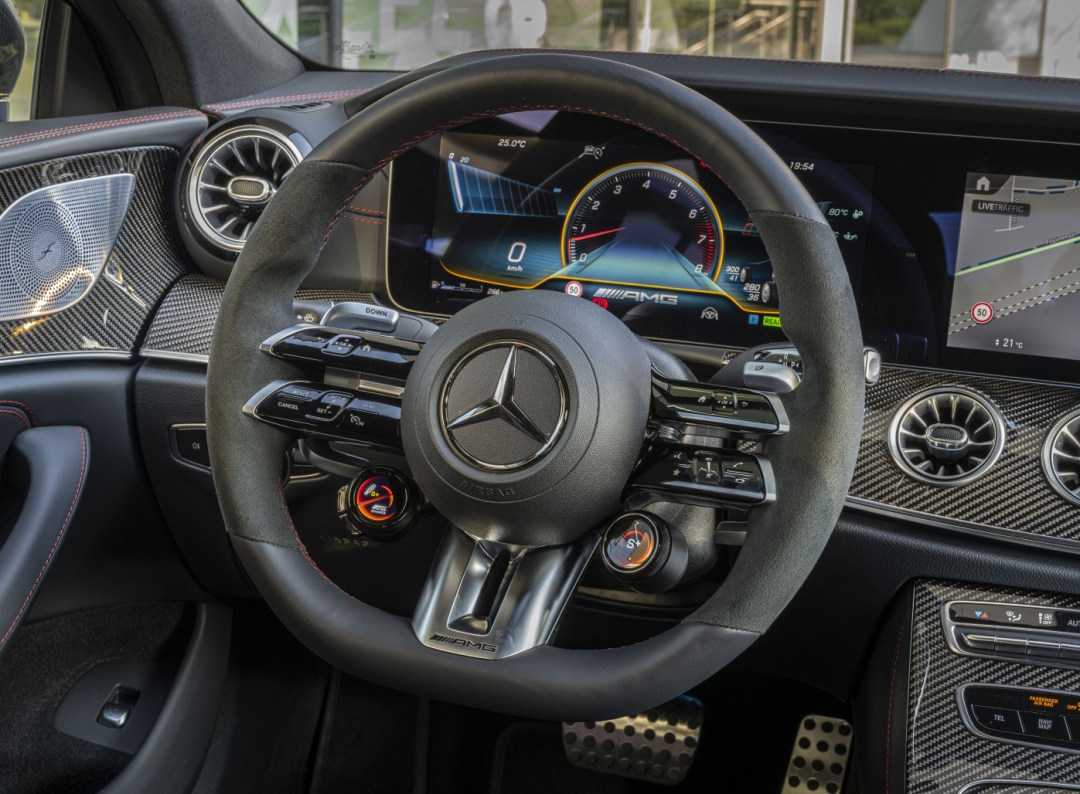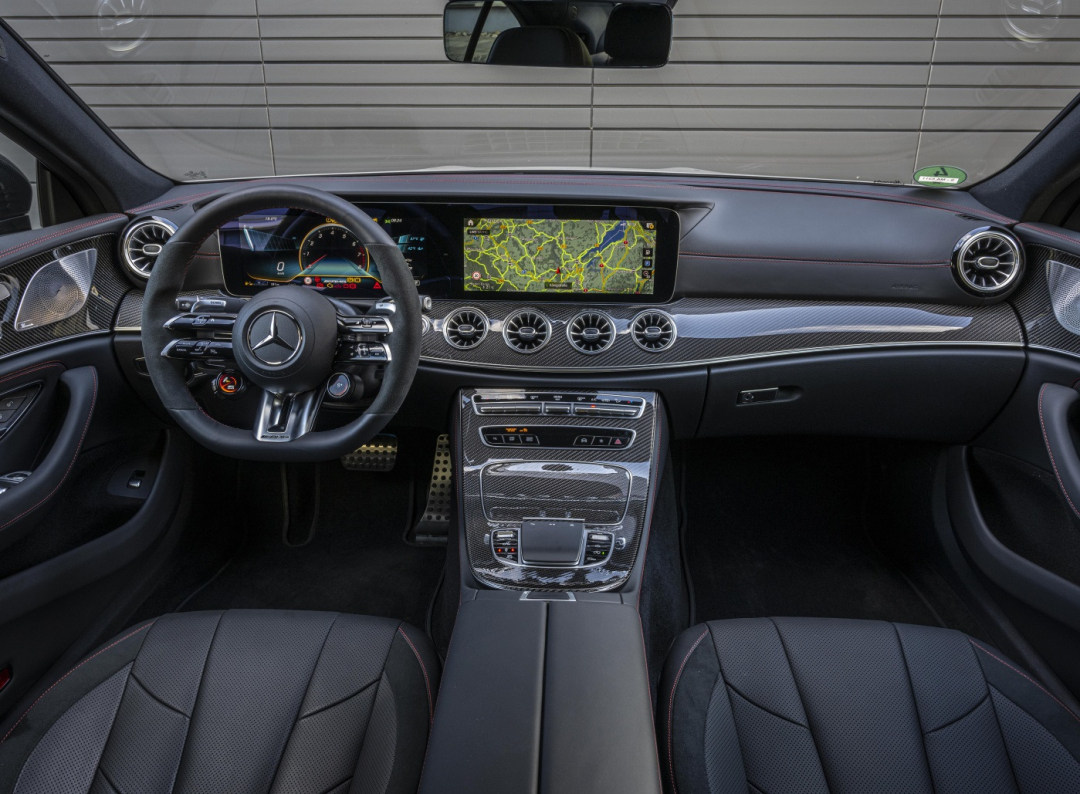 内饰方面,新款CLS 53 AMG还没有升级为奔驰家族式最新的设计语言,而是保留了双连屏这种设计风格,但这并不妨碍这是目前最为优秀内饰设计,将奔驰与生俱来的那种豪华感体现得淋漓尽致。且新车还使用了大面积的碳纤维装饰板和红色缝线工艺,质感非常出色。