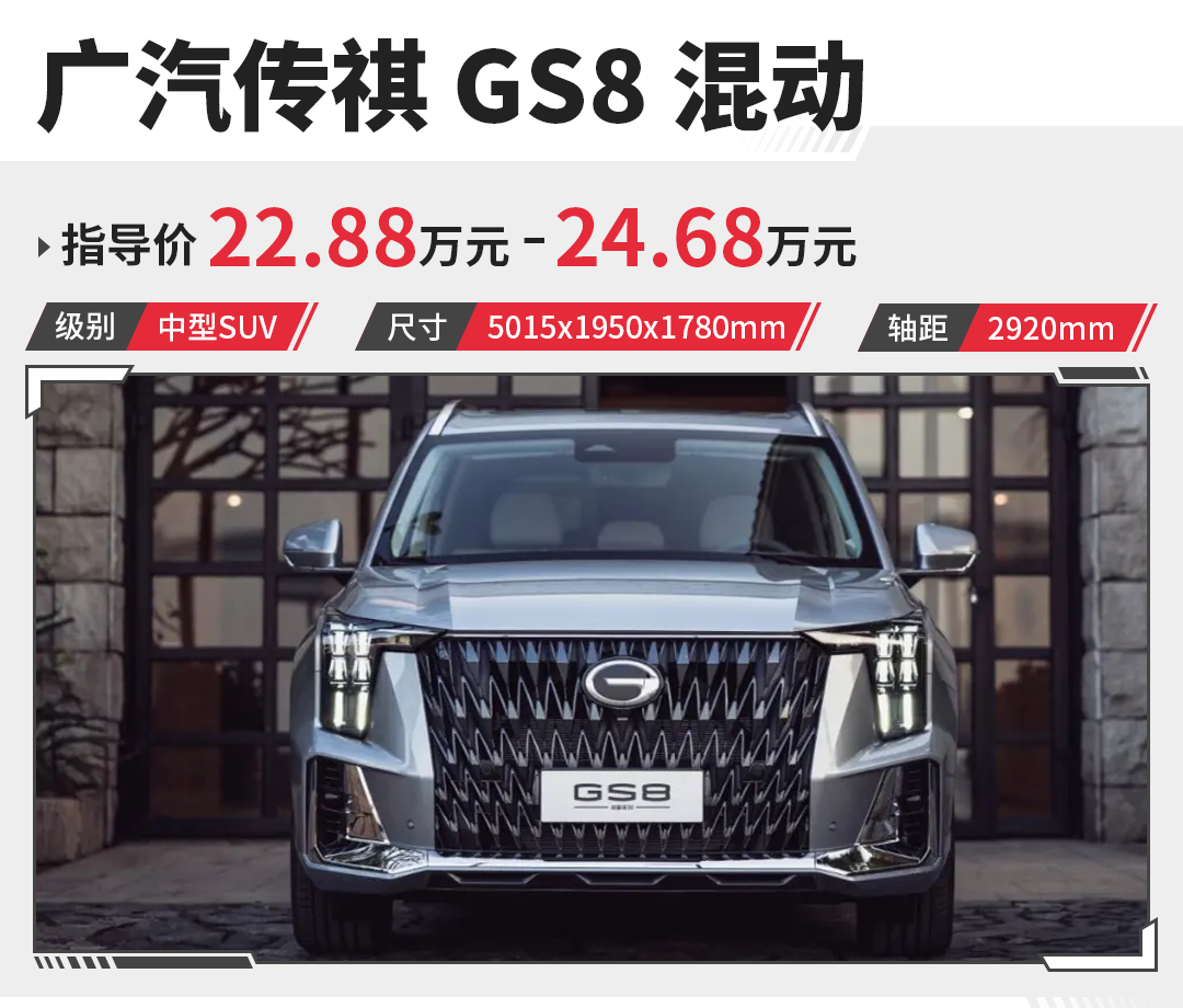 广汽传祺GS8是首款搭载丰田THS混动技术的中国品牌车型,是由传祺自研的2.0TM发动机与丰田第四代增强版THS系统组成,发动机最大功率140kW,峰值扭矩320N·m,官方NEDC工况油耗5.3L/100km。