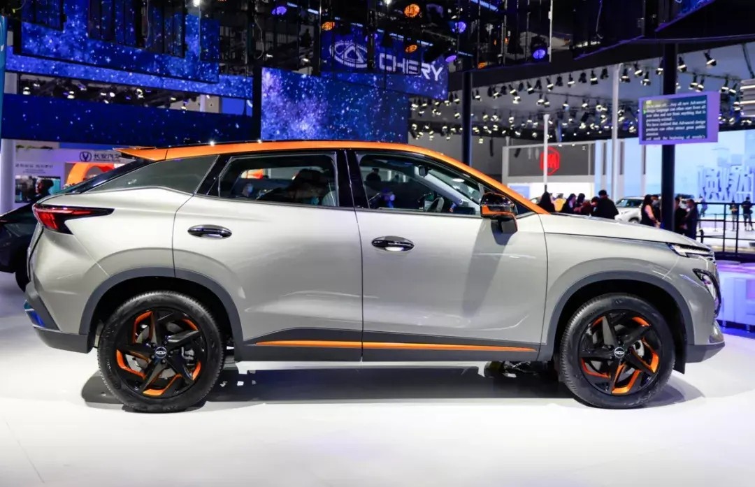 奇瑞OMODA 5前脸采用大尺寸无边框设计元素,内部还进行镂空样式的处理,车侧也采用当下最为主流的俯冲式轿跑姿态,此外,还在周边融入有橙色元素点缀,配合上悬浮式的车顶和旋风式轮毂,极具运动感。