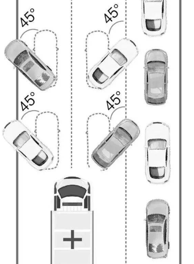 还有一种最近很火的“45度让路法”,主要是应对拥堵路段。这个方法实际是利用车辆与车辆,车辆与围墙等阻挡物之间的剩余距离。左边车辆将车身往左调整45度,右边车辆将车身往右调整45度,那么空出来的距离就足够后方的应急车辆通行。