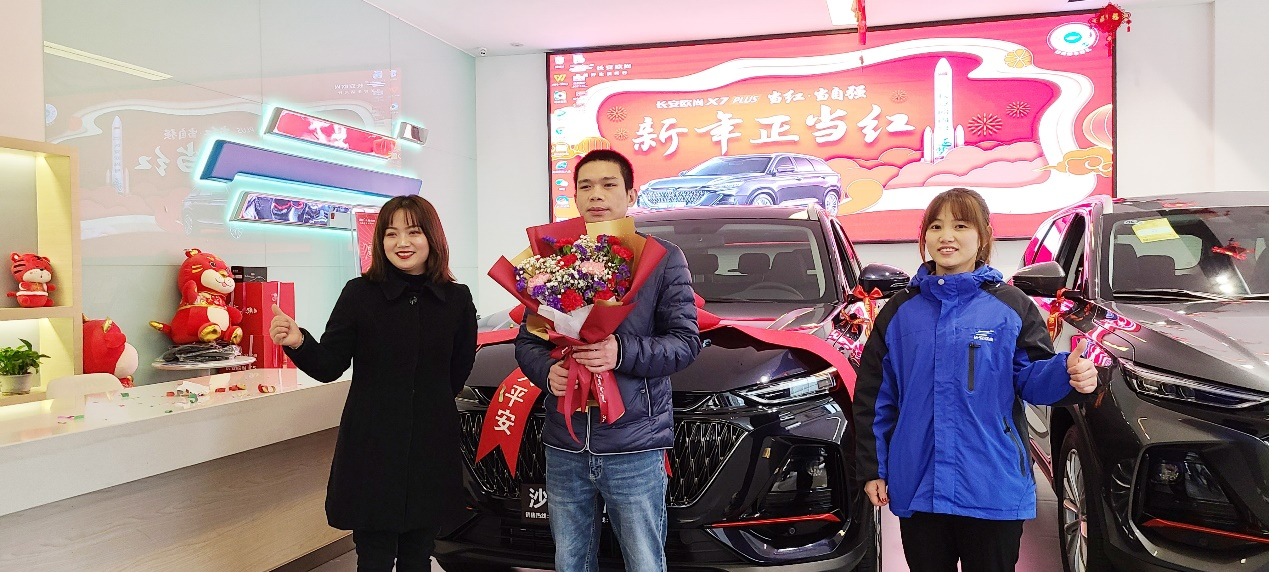 4S店里,不断有客户前来看车,有的带着孩子父母一起,让家人感受车内空间和座椅舒适度,目的是要买一辆全家人坐着都舒服的车。同时,也有用户前来提车,工作人员在欧尚X7 PLUS车头挂上红花,寓意红红火火,吉祥如意,并郑重地将钥匙交到用户手上,满满的仪式感,让用户感到诚意和用心。