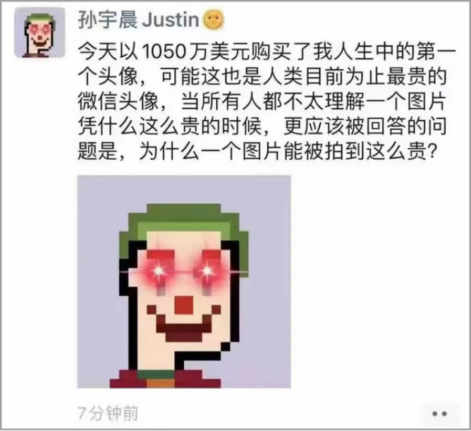还有更贵的,像国内孙宇晨老师就花了1050万美元买了一个当微信头像。