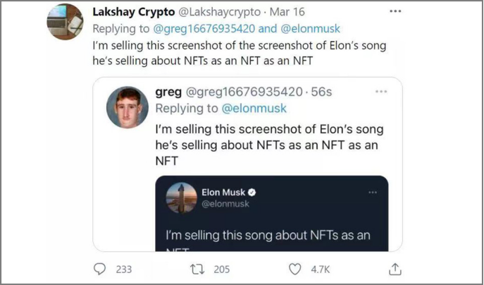 当然更聪明的还得是网友们...因为有人直接把马斯克的这条推特截了个图,也当作NFT去卖...接着就是一轮又一轮的套娃截图。