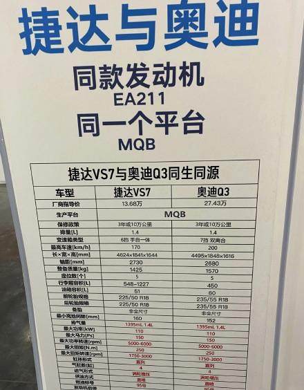 想必这位网友是看到了捷达VS7的宣传海报而来的,确实没错,捷达VS7用的就是奥迪Q3同款的EA211发动机,并且同样是基于MQB平台所生产,这则广告并没有虚假成分。