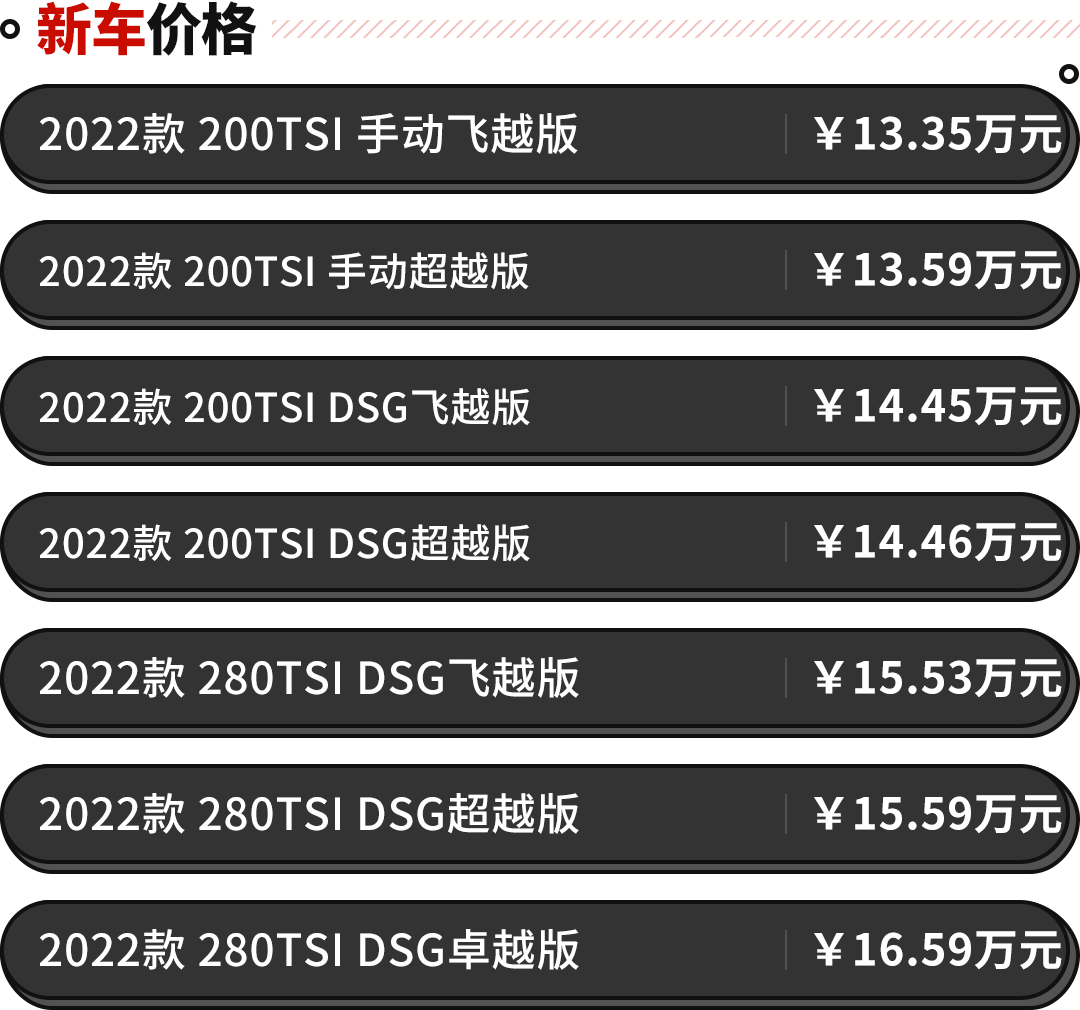 如果奔着性价比出发,且又喜欢手动挡车型,可以考虑2022款 200TSI 手动超越版 ,配置并不差,标配7安全气囊、胎压报警、驾驶疲劳提醒、倒车影像、后驻车雷达、定速巡航、自动驻车、全景天窗、前排无钥匙进入、真皮方向盘/座椅、支持CarPlay/CarLife、远近LED大灯、10色氛围灯以及后排空调出风口等。按优惠2.8万元来算,全款落地12.5万元左右。