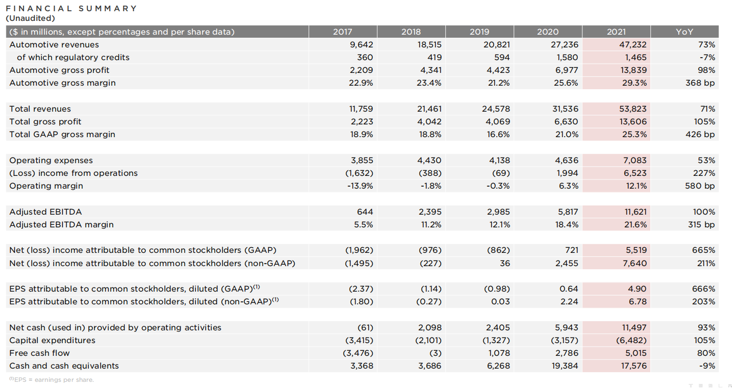 2021年第四季度,特斯拉总收入达177亿美元,同比增长65%,GAAP营业利润为26亿美元,实现了14.7%的营业利润率。GAAP净利润为23亿美元,同比增长760%,非GAAP净利润(未计股份支付费用)为29亿美元,创造历史新高。