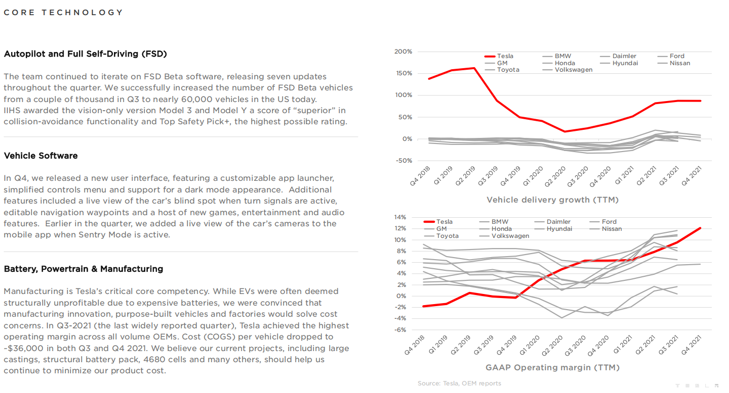解读:减去资本性支出后,2021年第四季度特斯拉的营运现金流(自由现金流)仍达到28亿美元,并实现所有量产整车厂中最高的季度运营毛利率,全年更是创造了55亿美元的GAAP净利润以及50亿美元的自由现金流。这不仅展现出特斯拉的盈利能力,也表明电动汽车比燃油汽车更具市场前景。