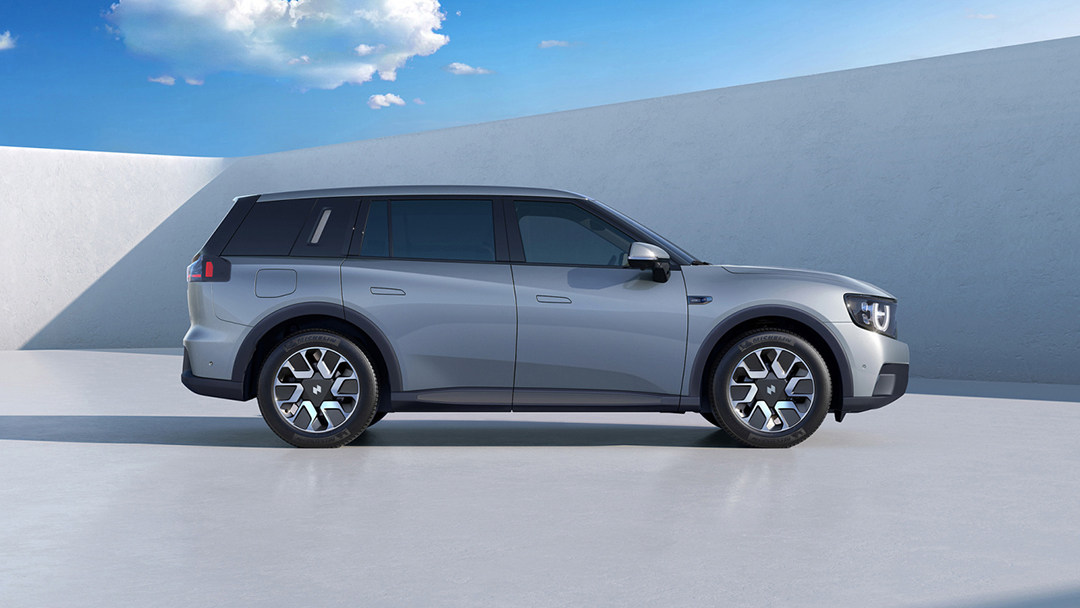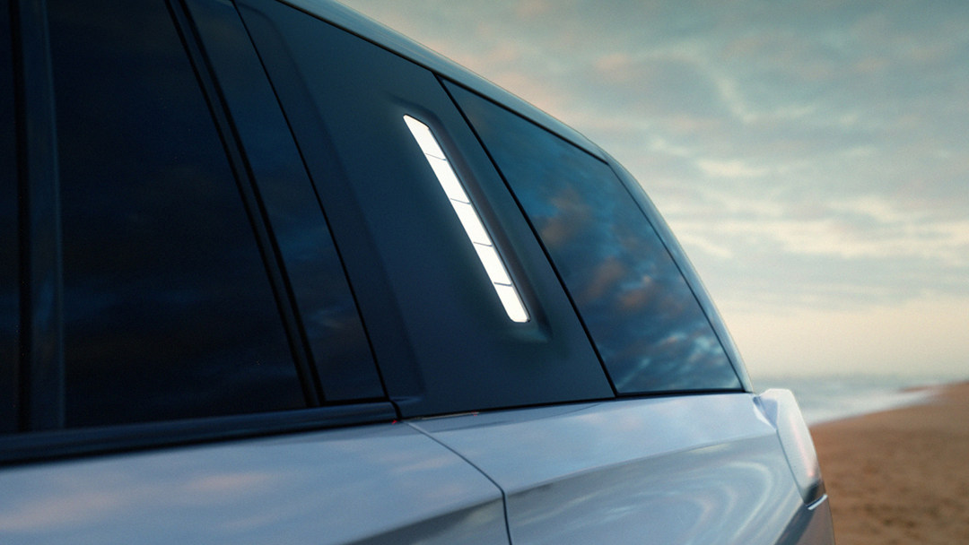 侧部明显就是“Less is more”设计理念,平直线条、圆润形面下它没有多余的元素,形面通过腰线营造出不错的光影效果,悬浮式车顶设计则是缓解中大型SUV大尺寸带来的呆板印象。造型独特的大尺寸轮毂、弹出式门把手,则属于锦上添花般的配置。
