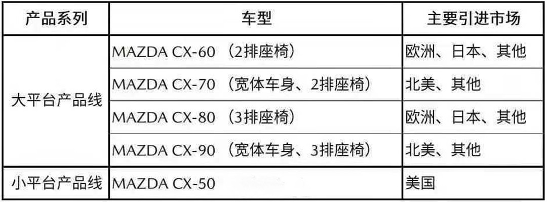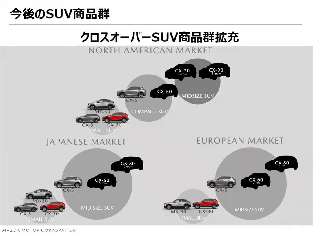 马自达CX-60和CX-80将主要针对欧洲和日本市场,而CX-70和CX-90则服务于美国市场。