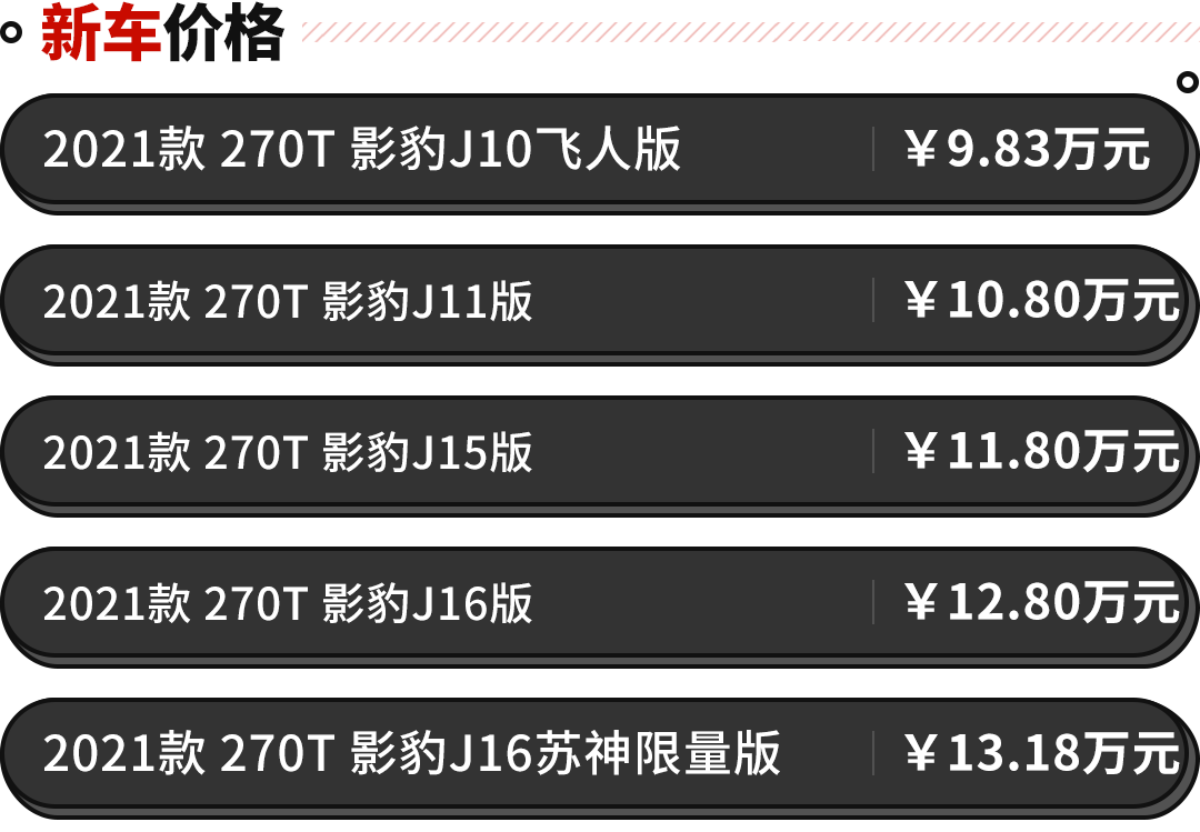 总体配置来看,性价比最高的是影豹J11版本和J15版本,指导价分别为10.80万元和11.80万元,算上购置税和保险等费用,全款落地分别为12.5万元和13.6万元。根据自身预算,做出合理选择就可以了。当然在预算充足的条件下,且非常影豹这款车,那直接选择顶配苏神限量版,指导价为13.18万元,全款落地下来15.1万元左右。