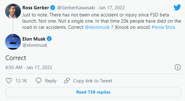作为特斯拉的股东之一——Ross Gerber曾表示,在FSD beta发布后的一年多测试中,暂时未出现过车祸以及人员受伤等情况,但在这段时期却有20000人死于交通意外。想必该股东的潜台词即——你可以永远相信FSD。随后特斯拉CEO——埃隆·马斯克也回应道“这是毋庸置疑的”!