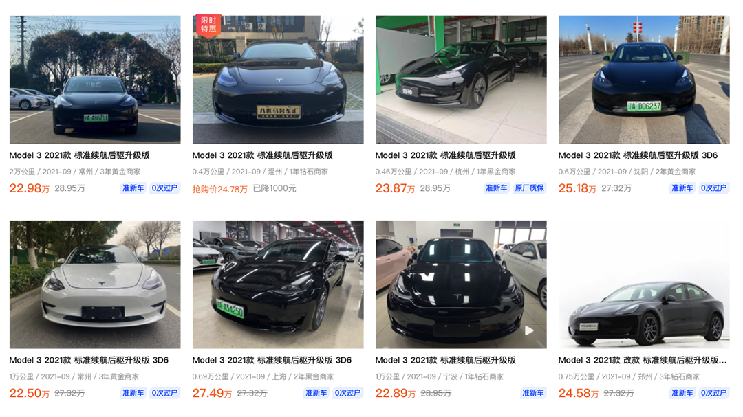 2021年中后提车的车主也同样高兴,因为用了半年多时间,部分居然能原价、甚至加价卖出,这可真够魔幻的。参考某二手车交易平台,2021年下半年二手Model 3价格基本达到23.8万,四舍四五等于白用了半年…
