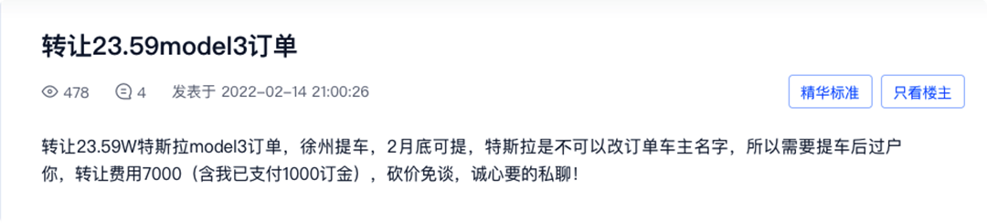 所以如今的特斯拉论坛,大家并不是讨论车机、续航等用车了,也不是之前那样讨论交付时间。而是充斥着订单转让,毕竟一转手就能赚个3-7千,这是限于未交付新车。