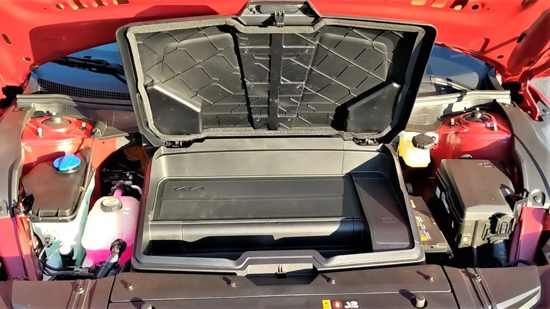当然,除了后备厢之外,起亚EV6在前机舱下还隐藏了一个置物箱,尽管内部的空间不算大,但是放下常用的背包,基本也毫无压力。