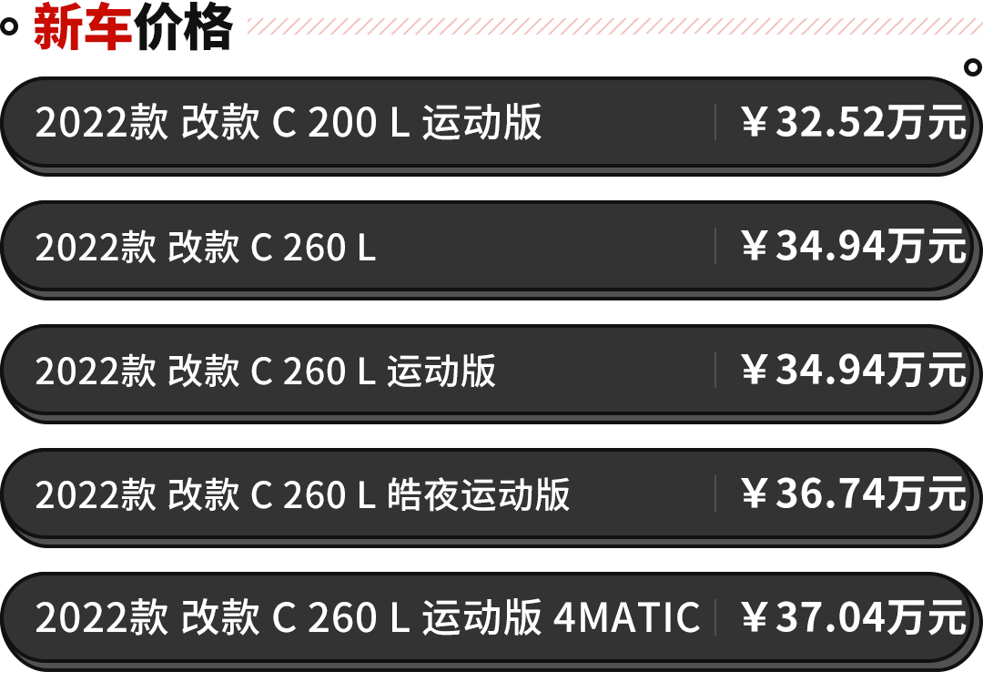 今日,买买君从奔驰官网获悉,2022款国产奔驰C级改款上市,新车共推出5款车型,包括1款C 200L和4款C 260L车型,售价区间为32.52-37.04万元。