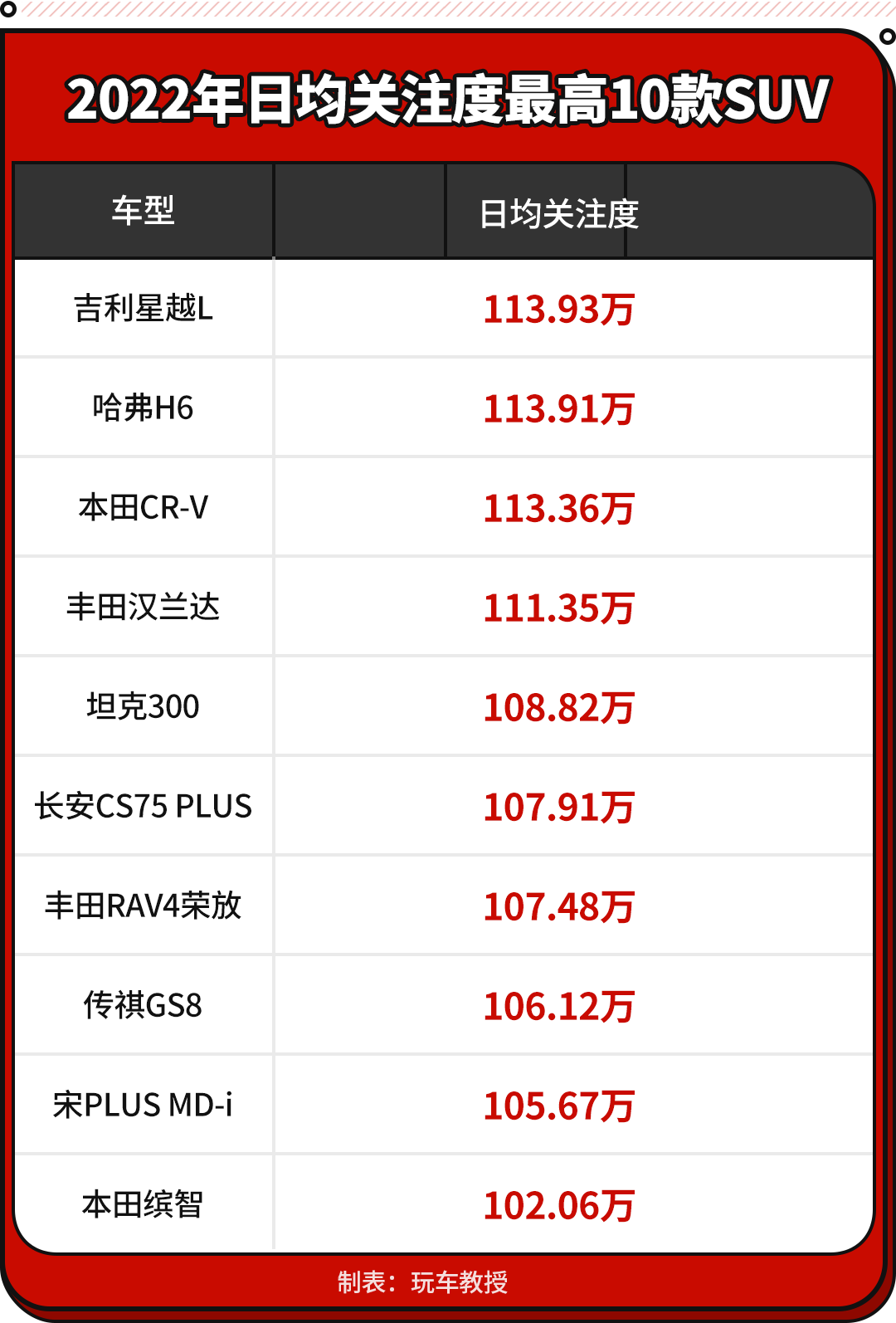 与销量榜不同的是,排在第一的并非哈弗H6和长安CS75 PLUS,反倒是新晋之星吉利星越L,它的日均关注度达到了113.93万。星越L是吉利汽车在去年7月份上市的一款紧凑型SUV,它延续了星瑞高性价比、高品质的路线,预售48小时订单破万,又是中国自主品牌里的佳作。