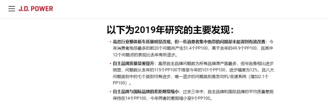 从J.D.Power上也能发现端倪,在2009年的发布的中国新车质量研究表明,自主品牌新车质量得分是258个PP100,从J.D.Power的解析来看,说明100台车里面出现了258个问题。