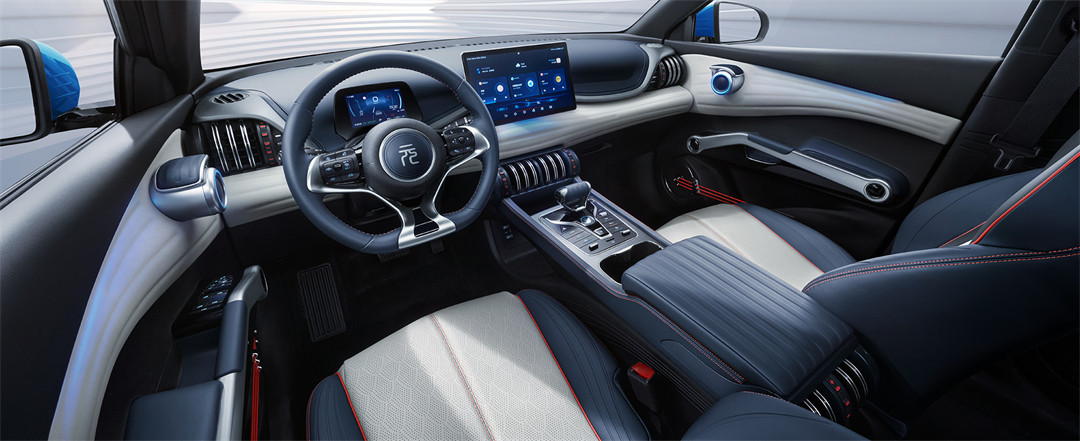中控台和门板的线条呈波浪状,空调出风口为哑铃片样式,门开关和音响造型别具一格。这种有主题的内饰设计在比亚迪海洋系列的海豚上也有出现。