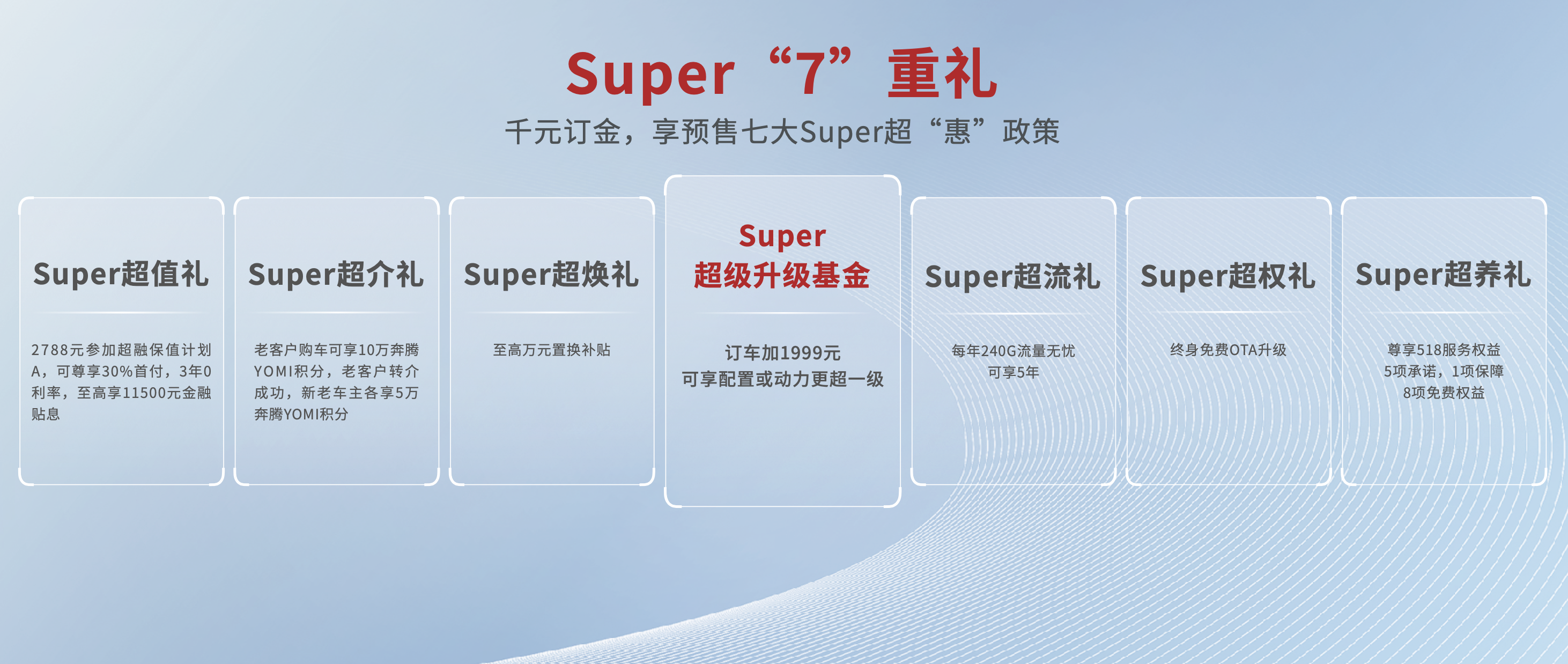用户只需1000元订金,即可享受Super“7”重礼,其中最具代表性和创意的是“Super 超级升级基金”:用户下订后,通过奔腾YOMI app额外支付1999元,即可将车辆升级为同等动力更高一级配置或同一配置更高动力的车型(部分车型可实现),在有限预算下兼得更优配置与更强动力,精准解决年轻人的选择焦虑,最大化满足年轻人“给自己更好的”内心渴望。除此之外,更给力的金融政策、至高万元置换补贴、五年中每年240G免费流量、终身免费OTA升级、老客户购车享10万奔腾YOMI积分等超“惠”政策,全面覆盖用户购车、换车、用车、养车全流程,全方位惠及用户切身利益。
