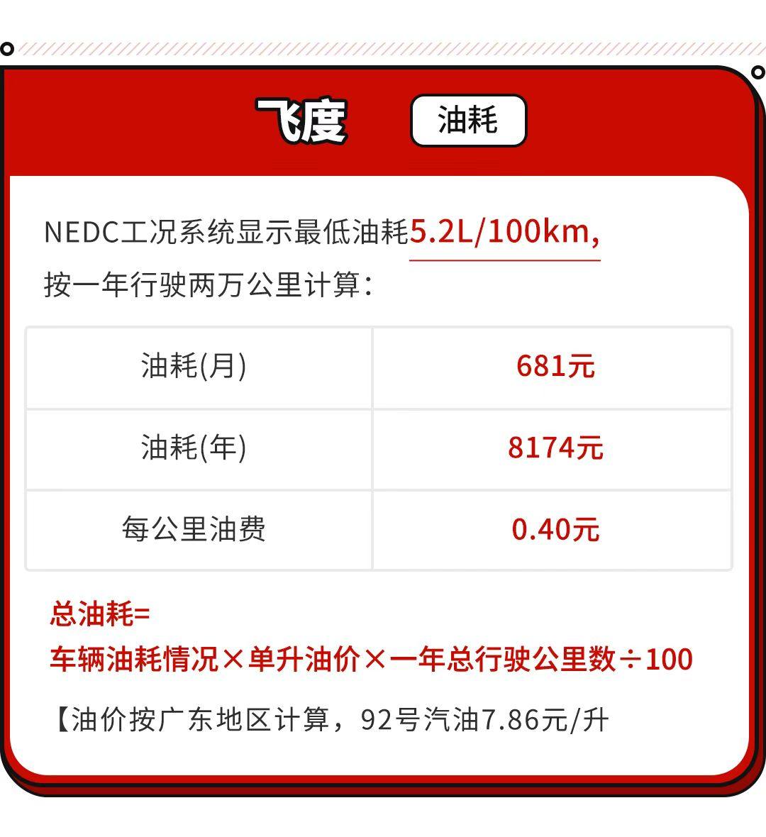 在同样一年两万公里的测算标准下,以当下广东地区92号汽油7.86元/升的油价“换算”。理论上得出飞度每公里油耗花费0.4元,年度油耗花费8174元的“理论油耗花费”。