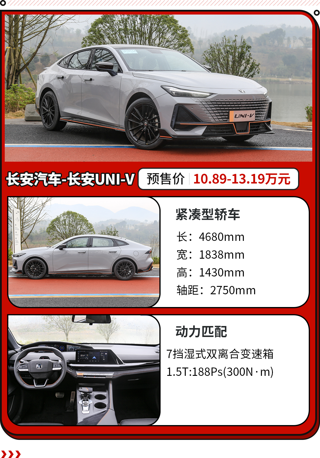 至于外观和内饰方面,就不做过多赘述了,此前已经介绍多次了,动力方面,长安UNI-V搭载蓝鲸NE1.5T四缸发动机,最大功率188马力,峰值扭矩300牛·米,数据参数堪比部分2.0T低功率发动机。传动系统方面,匹配7速湿式双离合变速箱,百公里加速成绩还未知道,NEDC综合油耗为6.2L/100km。