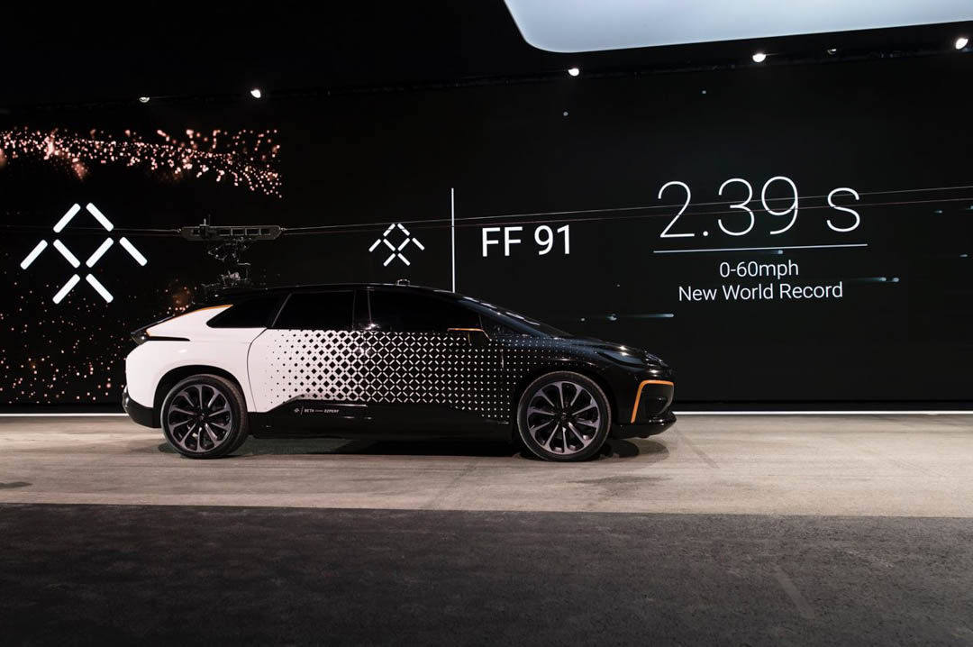 FF 91在动力方面所采用前一后二三的电机驱动布局,其最大输出功率可达1050马力,峰值扭矩高达1800牛·米。据官方介绍,FF 91的0-96km/h的加速时间不到2.4秒。