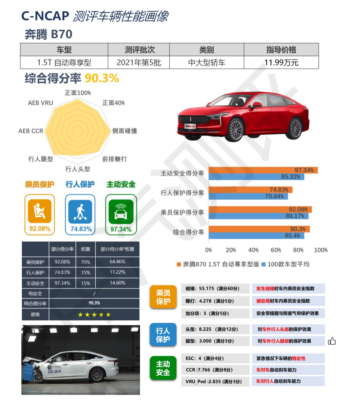 3月1日,中汽中心公布2022最新一批C-NCAP车型评价结果。全新第三代奔腾B70以同级优秀90.3%的综合得分率,荣膺C-NCAP五星安全认证,在乘员保护、行人保护和主动安全评价项目中表现均衡,实力彰显“超硬、超高、超多”安全品质。全新第三代奔腾B70继第二代奔腾B70后再次力斩五星安全评价,也是目前自主品牌唯一斩获两次C-NCAP五星安全认证的中级家轿,堪称“中国自主家轿安全领跑者”。