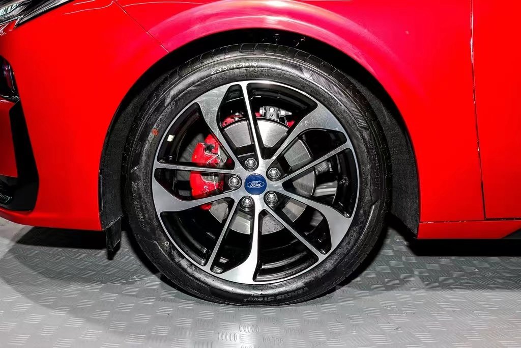 车身侧面比较简洁,采用了双腰线的设计,搭配隐藏式门把手,多了几分优雅尊贵感。其中ST-Line车型采用双拼色设计,上本身均进行黑化处理,加上风刃式的19英寸双色轮毂,以及前后都涂装红色的卡钳,呈现非常运动的视觉效果。