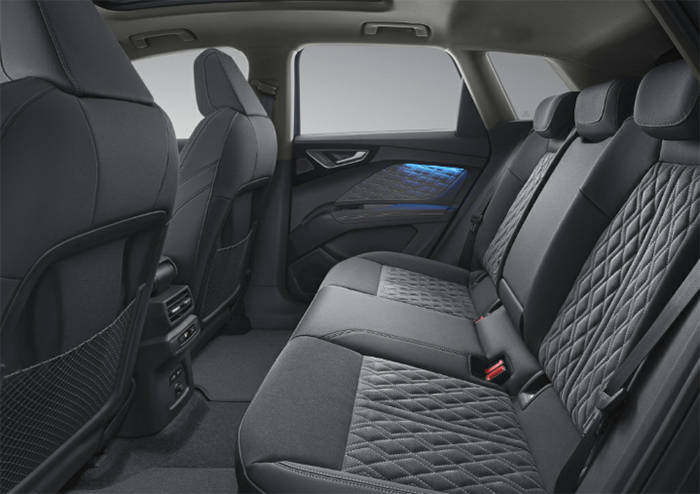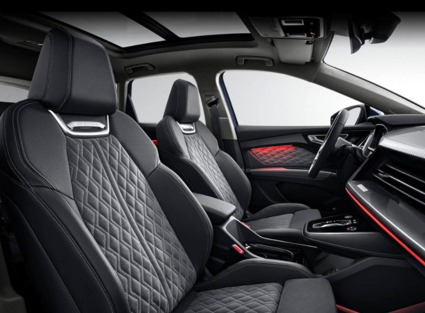 为了满足国内消费者对座椅方面的不同需求,奥迪Q4 e-tron提供了专属的双皮拼接打孔面料和带有菱形绗缝的 Dinamica 面料供国内消费者可选,座椅内部配备展现新能源的e-tron微标,彰显出它与燃油版有所区别的身份。
