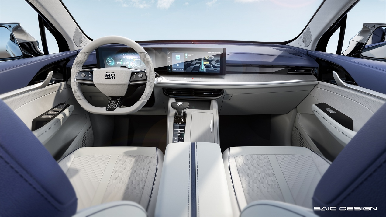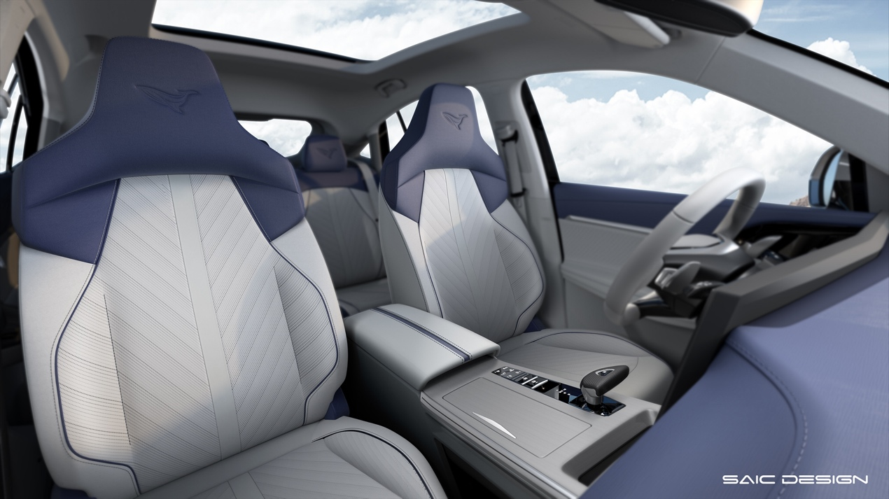 荣威鲸的内饰带有强烈“深海”气息,整体采用大面积蓝灰撞色设计,风格简洁明快, 方向盘中心专属“鲸”字标志及头枕等部位独有的“巨鲸”LOGO,极大提升了辨识度。
