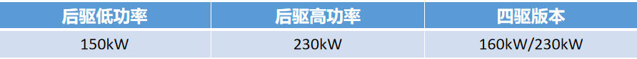 动力方面,根据工信部给出的申报信息来看,新车共有后驱以及四轮驱动可选。后驱版本则分别带有最大功率为150kW以及230kW两种不同功率的驱动电机可选。四驱版本则配备的是双驱动电机,前后电机最大功率分别为160kW、230kW,全系均配备磷酸铁锂刀片电池。