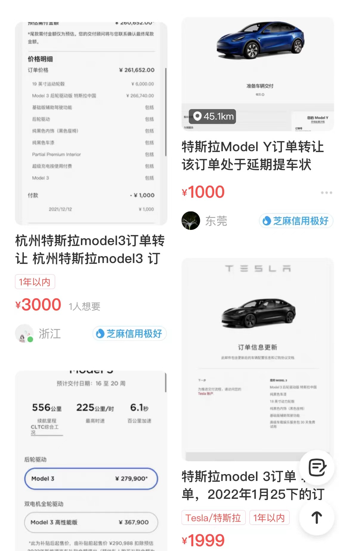 但其实也不是所有转卖订单都附有加价的行为,在“某鱼”也有出现一些降价的“捡漏”单子,特斯拉Model 3/Y就是其中之一,虽然特斯拉作为新势力的大厂,但订单数量也出现积压的现象,等车周期也延长至3-4个月。