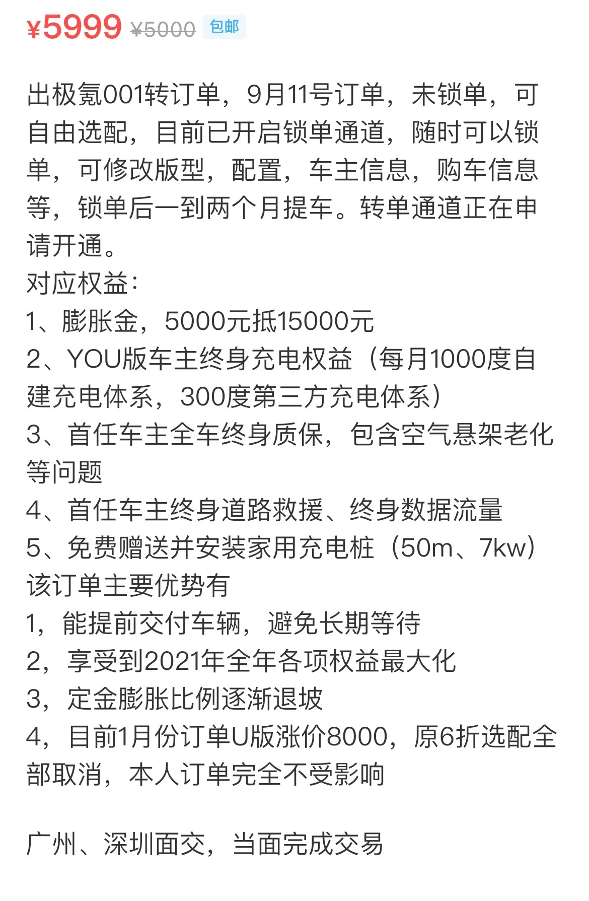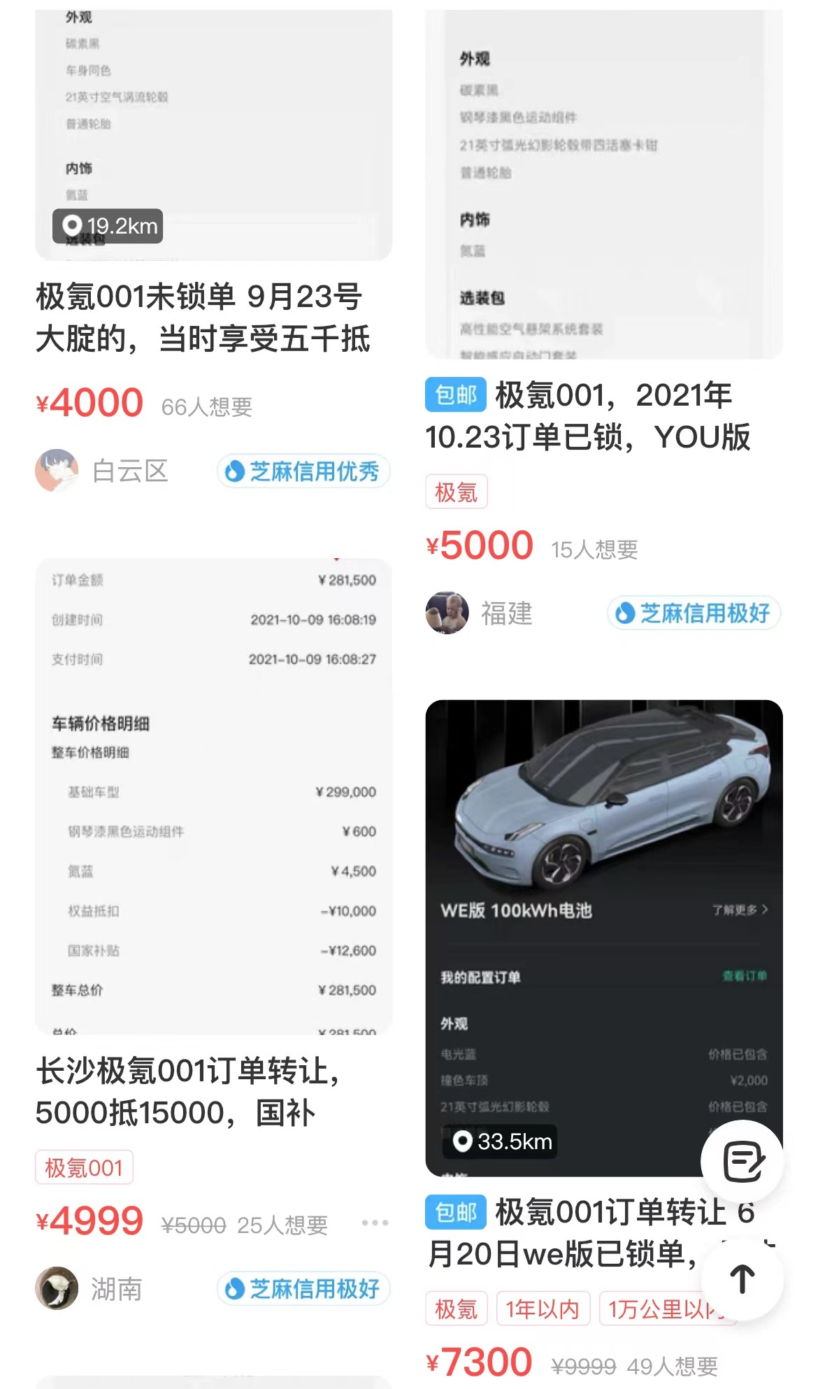 加上前期订单可享受首任车主权益,涵盖全车终身质保、终身免费充电、免费赠送家用充电桩等。所以嘛,各种ZEEKR 001预定单也涌现在“某鱼”中,目前普遍转让费在3000-5000元不等,可修改车主信息以及车型配置,并在锁单后1-2个月完成提车。