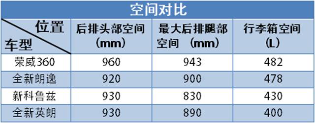 我们可以通过以上表格来认识一下荣威360的空间表现,在这里特意加入新款朗逸、全新英朗等空间不错的车型来做对比,这样我们就可以通过数据看出它们的差别!