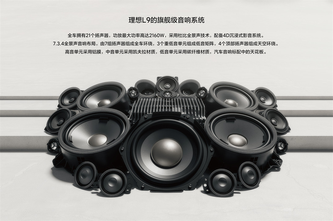 因此,理想L9配备了一套自研的音响系统,是由原Dirac中国区首席调音团队负责调试(曾负责调试沃尔沃宝华韦建音响系统),该系统共配有21个扬声器,功放最大功率高达2160W。