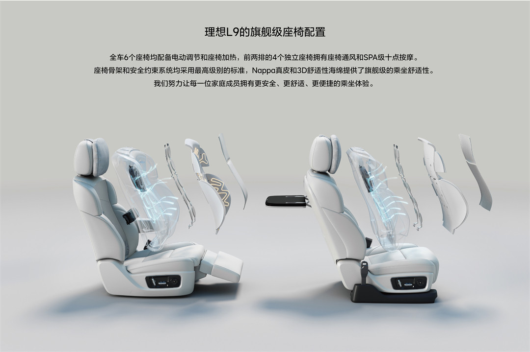 那么这时候再配备一张适合“躺平”的座椅就再合适不过了。然而贴心的理想汽车早就想到了这点,为前两排的座椅配备了座椅通风、加热、十点式按摩等功能,并采用Nappa真皮材质以及3D舒适性海绵填充。