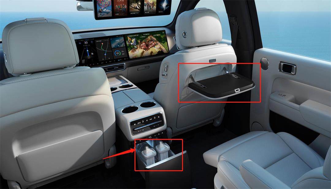 那么要做到保姆级的体验当然得融入到生活场景中来,从图中可看到,理想L9在扶手箱位置是配备了一个车载冰箱,能够放置一些牛奶、饮品等等,并且在副驾座椅的背板上配备了一块小桌板,可放置一些琐碎物品。姑且可以想象一下,当你有了小孩之后,那些琐碎的物品或者需要应急需要喂奶的时候,这台车一切都能够有条不紊地为你安排妥当,如果设计师没有对生活细致入微的勘察,怎能Hold得住这种细节呢?