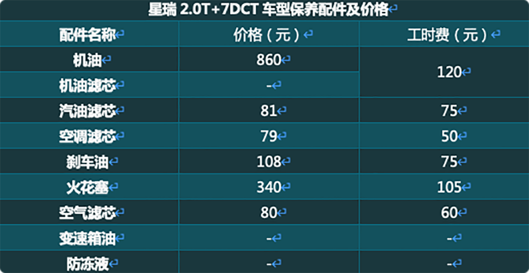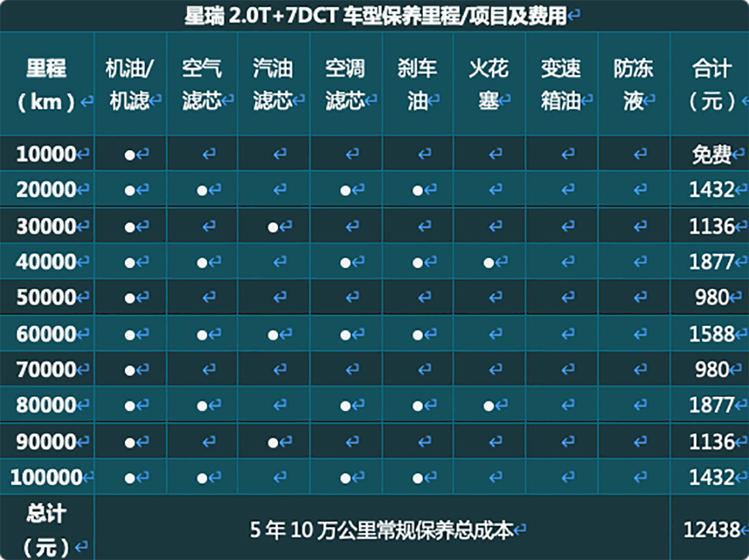 我们先看星瑞的配件价格,以及保养里程/项目,如下: