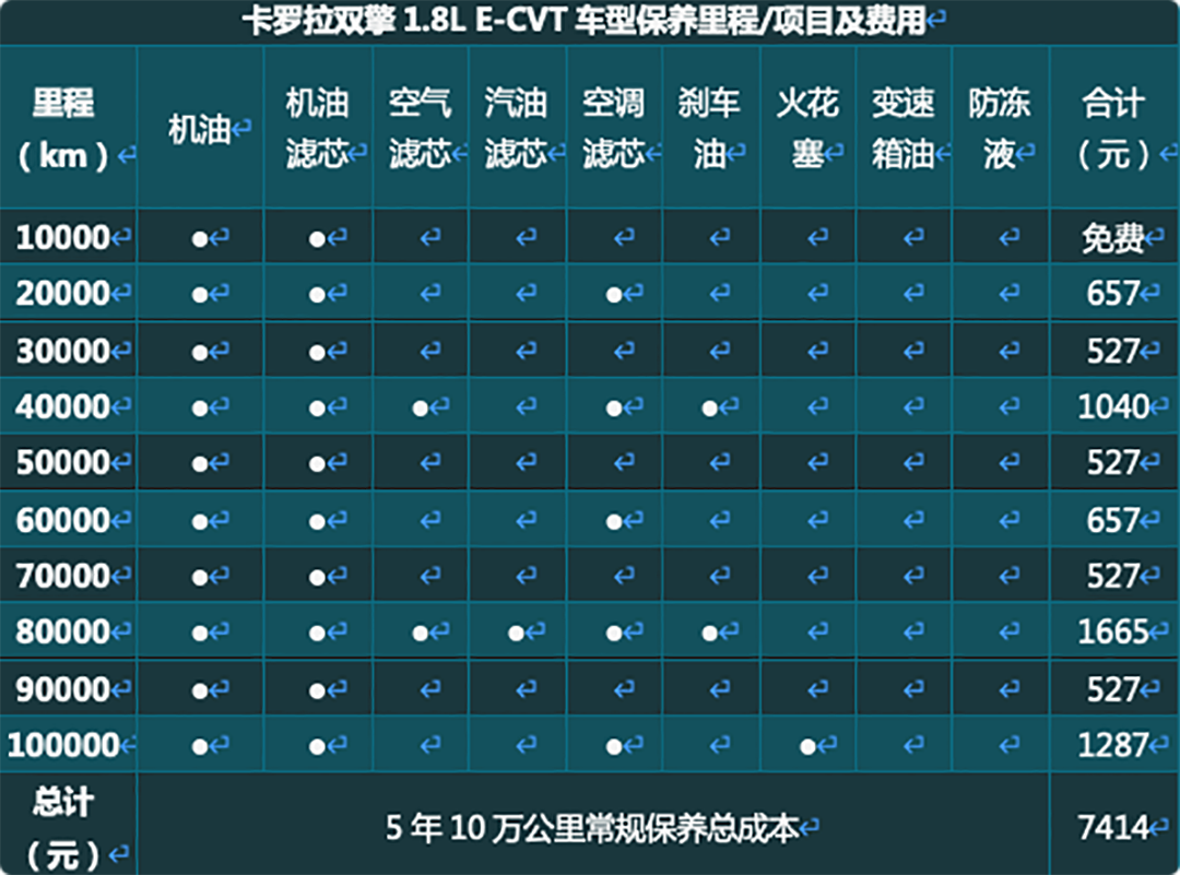 在此基础上,合计出卡罗拉5年的保养总费用,如下: